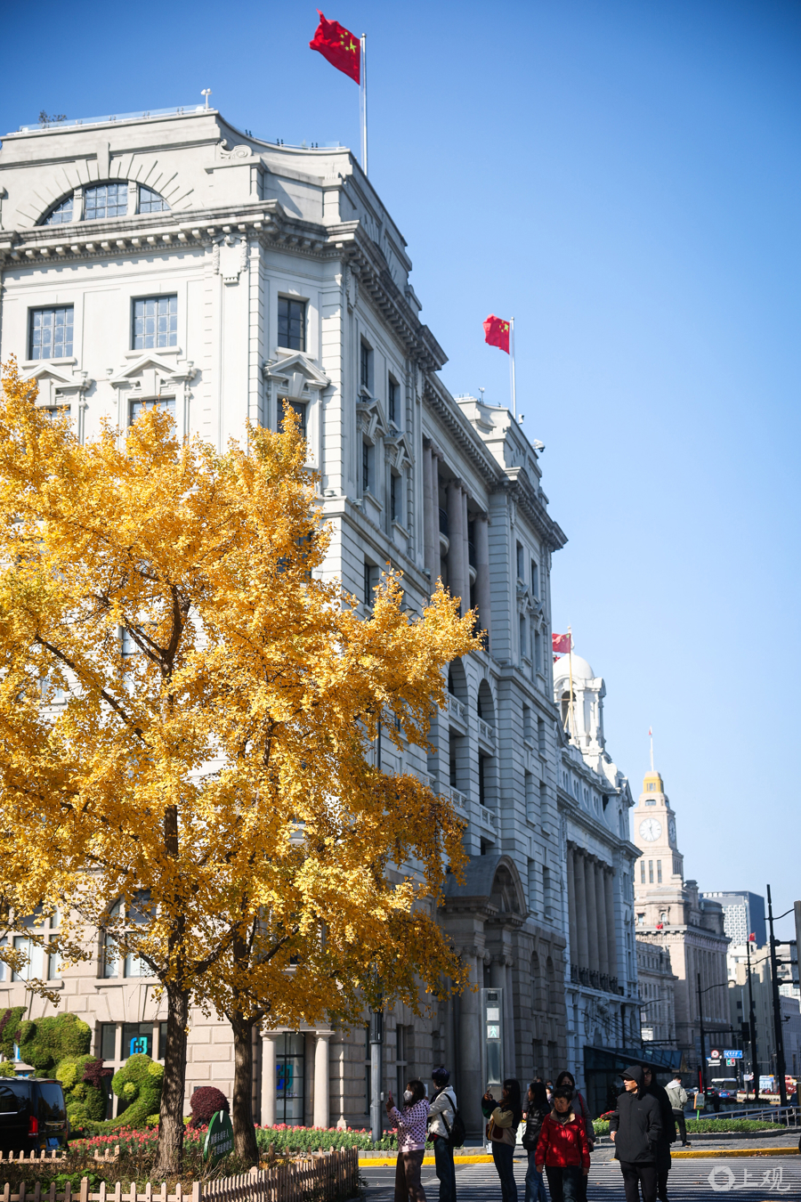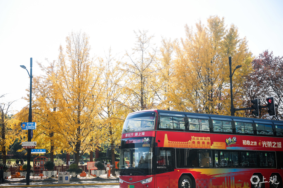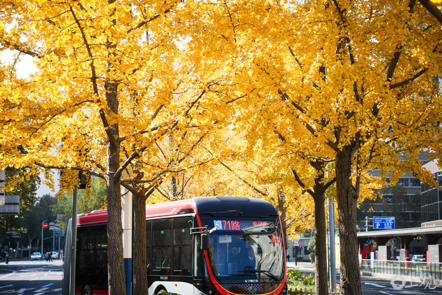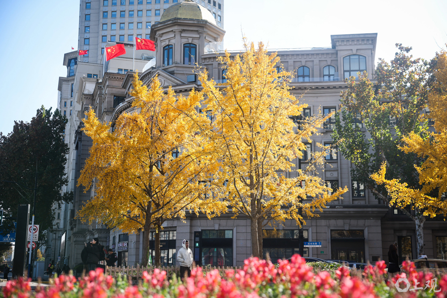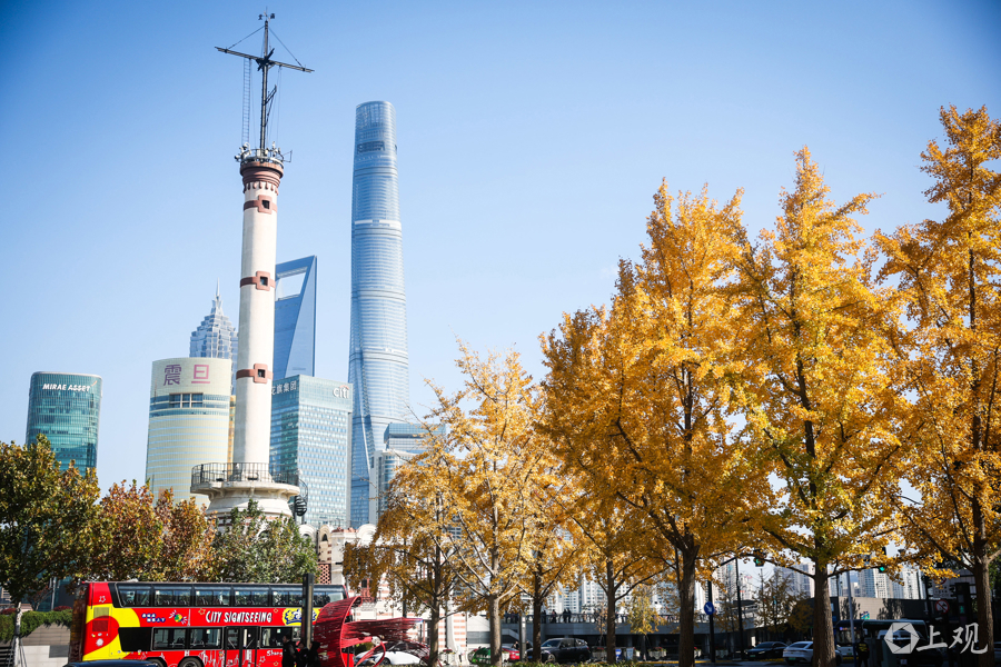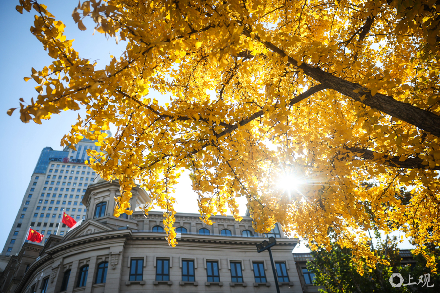 12月3日,上海晴空万里,中山东一路与延安东路路口银杏尽染金黄,叶影斑驳铺地。