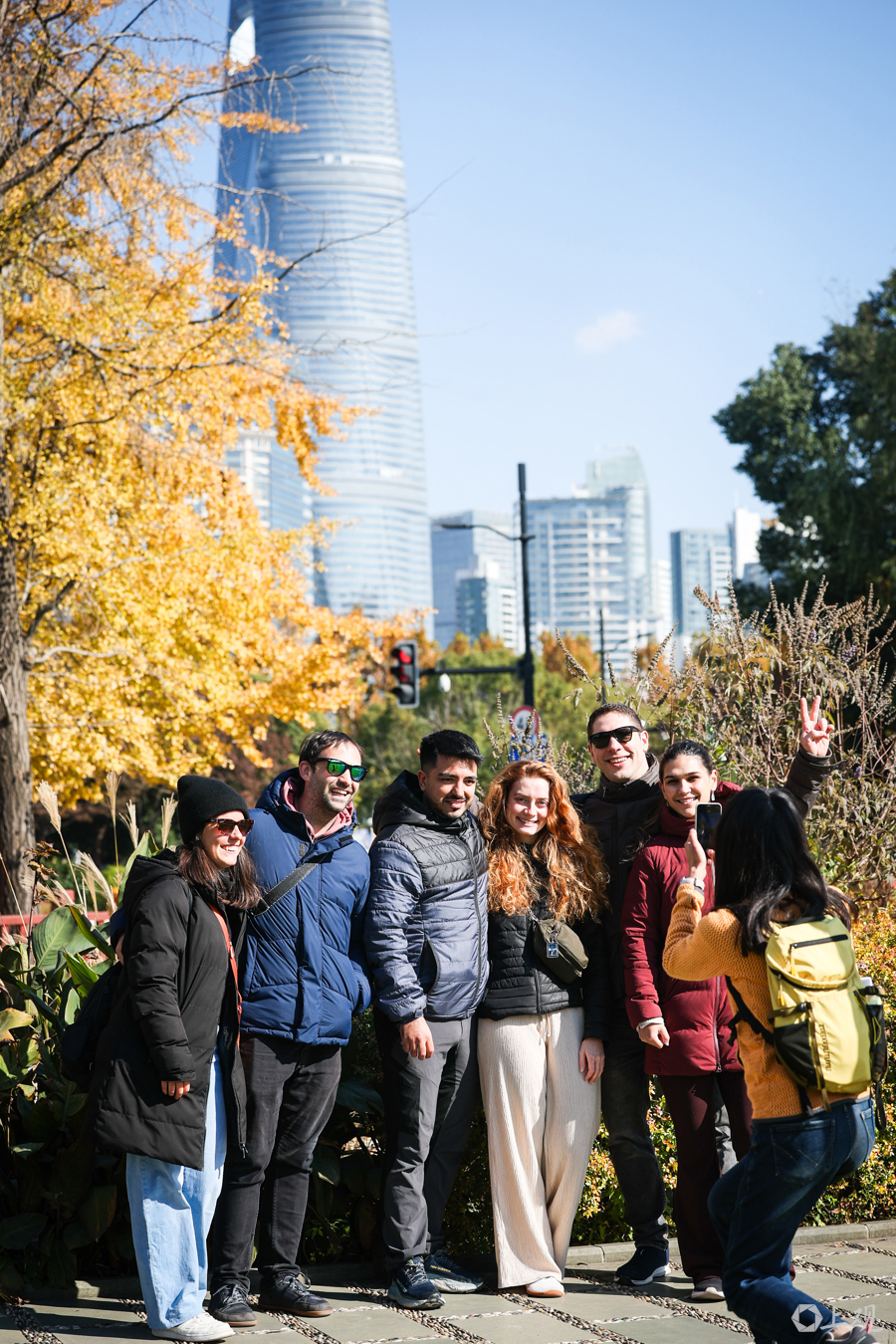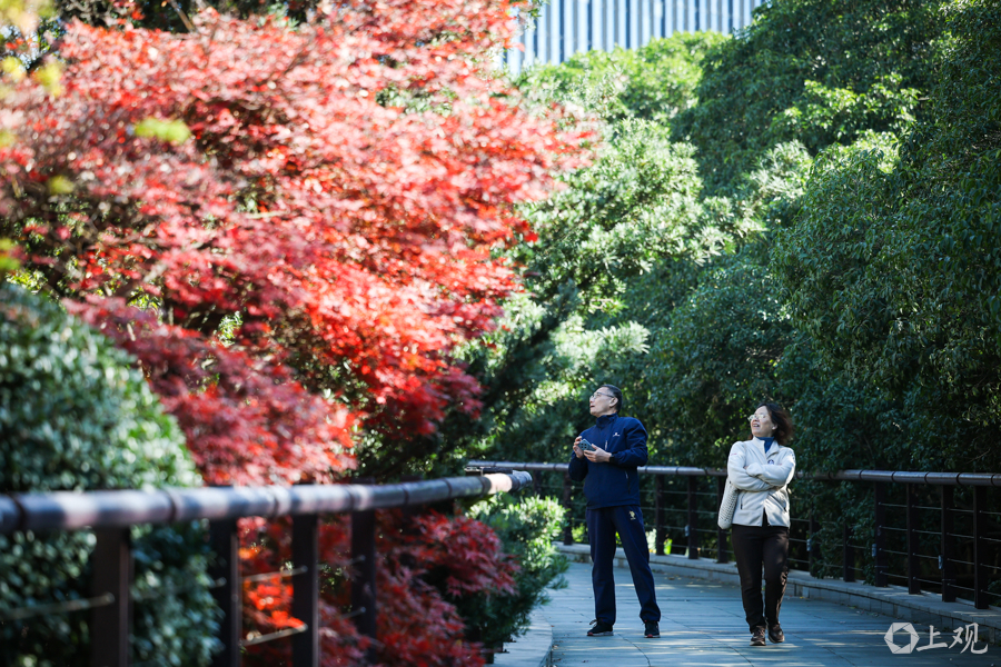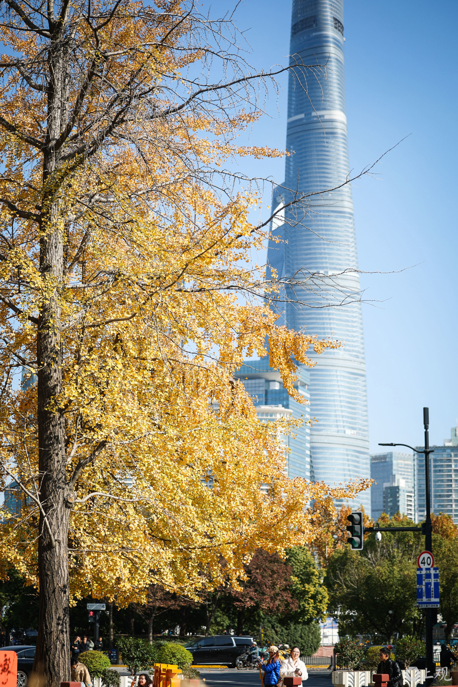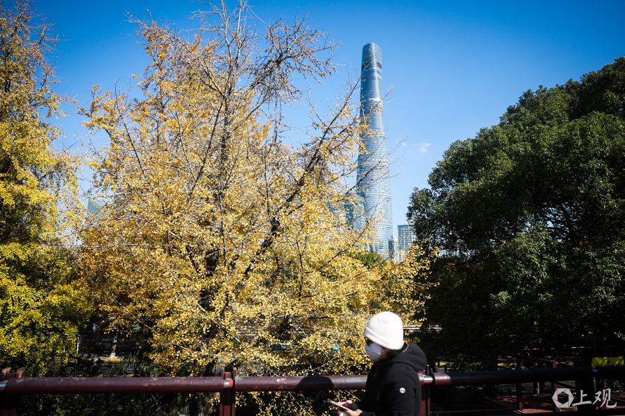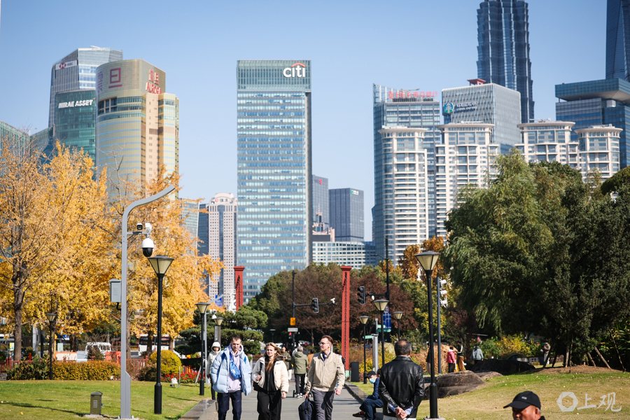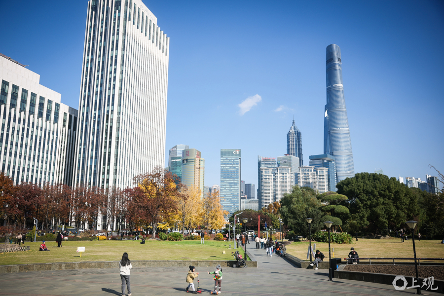 暖阳倾洒,与陆家嘴天际线相映,行人漫步其间,尽享申城深秋之美。