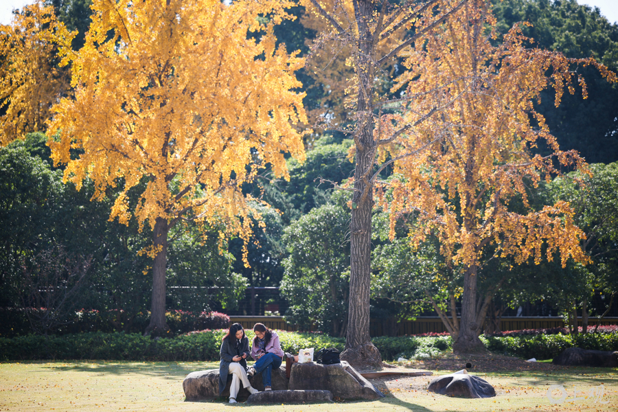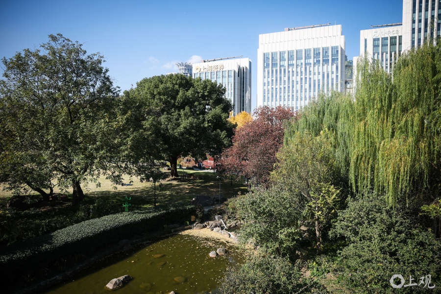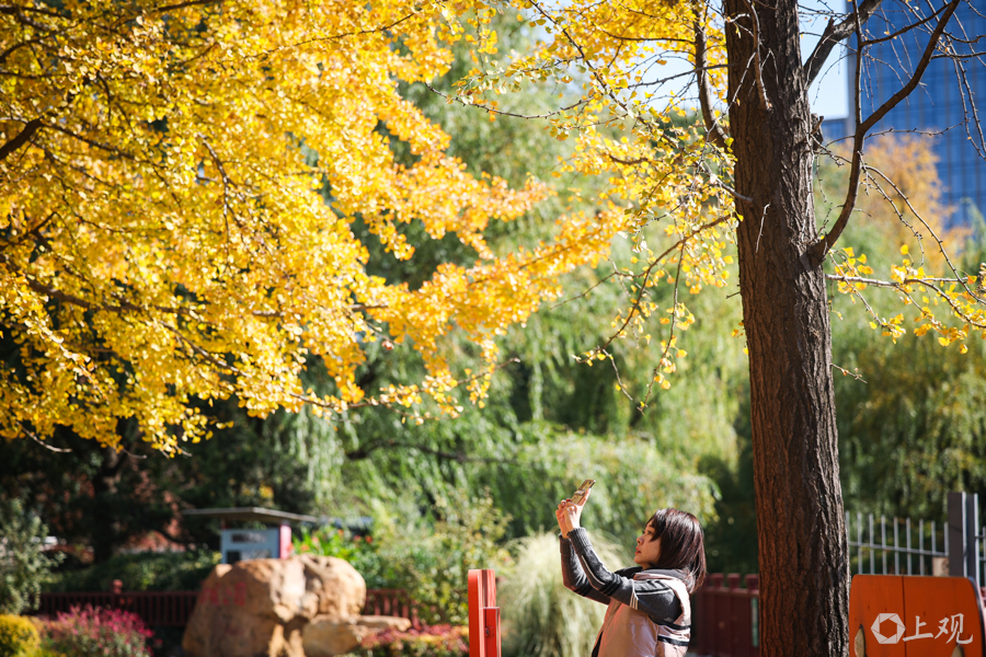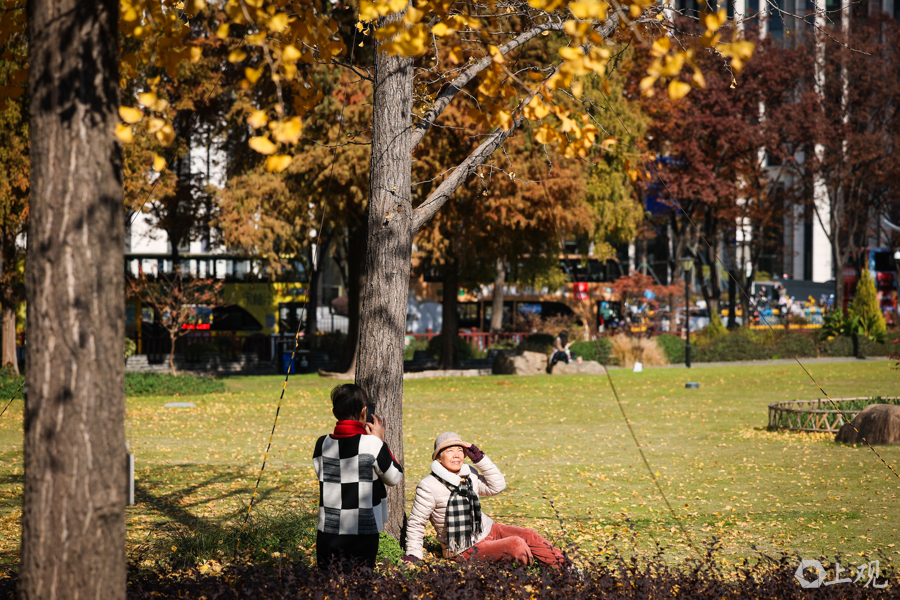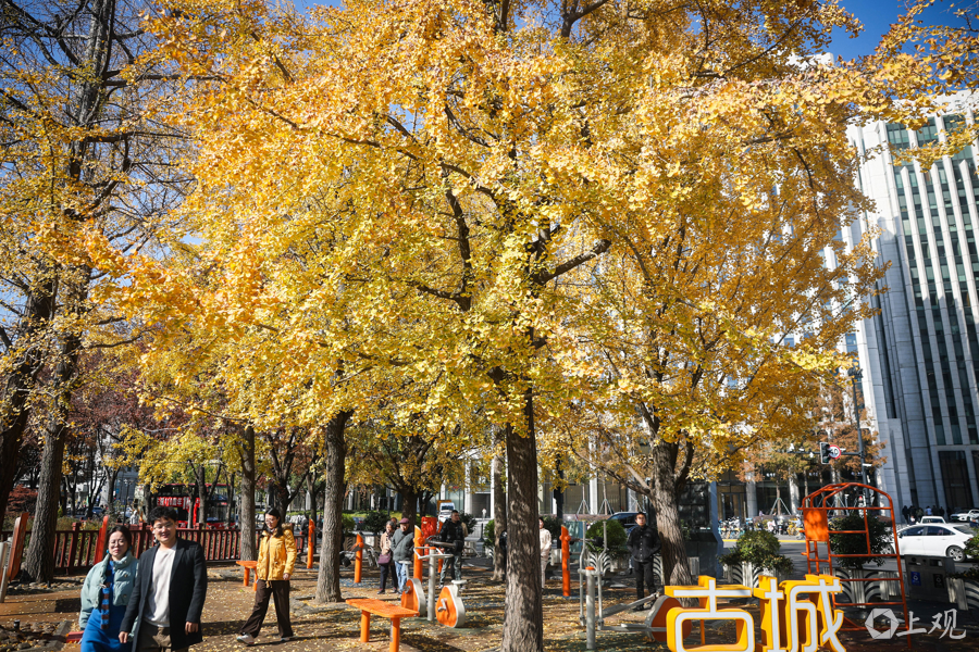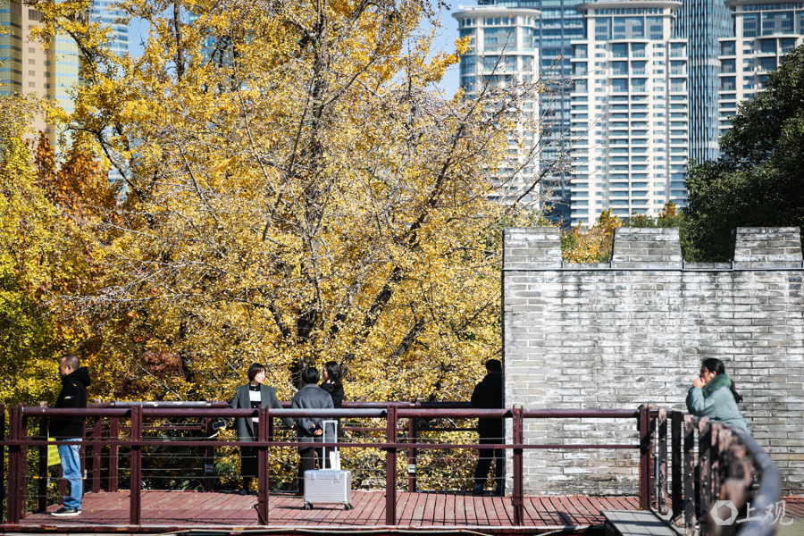 秋冬交替时节,公园内银杏金黄,市民游客可在此拍摄银杏与陆家嘴“四件套”同框的经典画面。